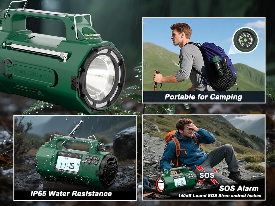 This model stands out because it goes beyond the normal emergency radio feature set. You get stronger battery capacity, wider radio band access, a large modern digital display, more precise controls, a spotlight flashlight, a 110dB panic alarm, IPX6 water resistance, and one of the most practical features of all: AAA battery backup.